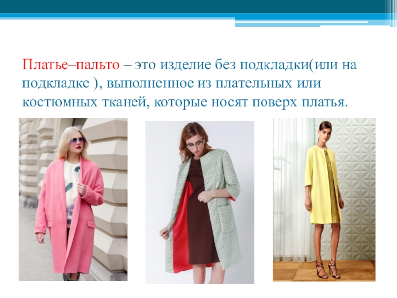 Платье–пальто – это изделие без подкладки(или на подкладке ), выполненное из плательных или костюмных тканей, которые носят