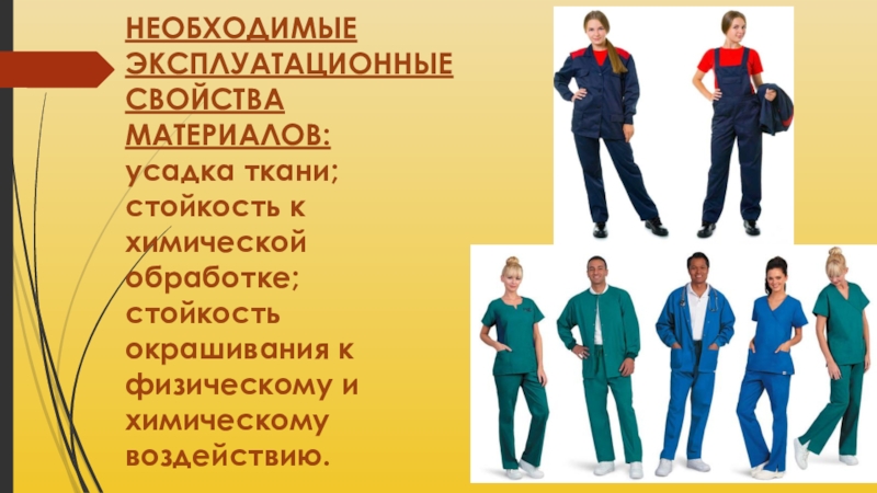 Слайд 6НЕОБХОДИМЫЕ ЭКСПЛУАТАЦИОННЫЕ СВОЙСТВА МАТЕРИАЛОВ: усадка ткани; стойкость к химической обработке; стойкость