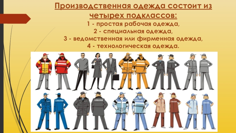 Слайд 2Производственная одежда состоит из четырех подклассов: 1 - простая рабочая одежда, 2