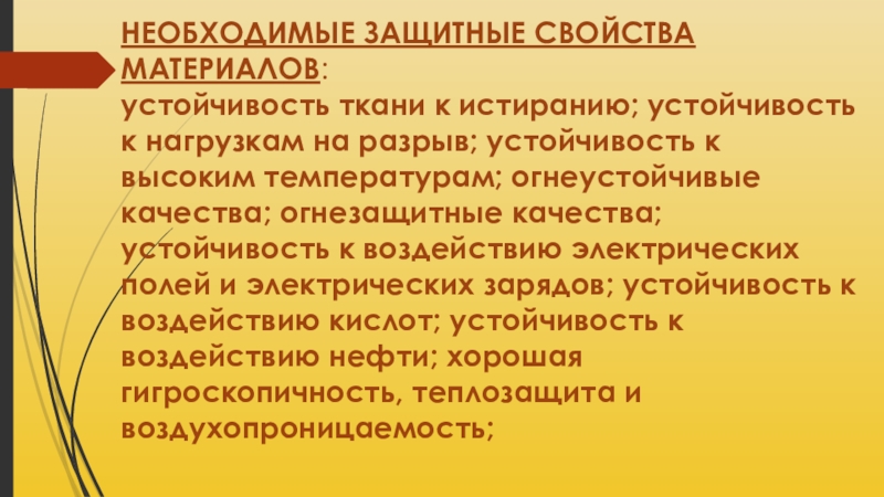 Слайд 5НЕОБХОДИМЫЕ ЗАЩИТНЫЕ СВОЙСТВА МАТЕРИАЛОВ: устойчивость ткани к истиранию; устойчивость к нагрузкам