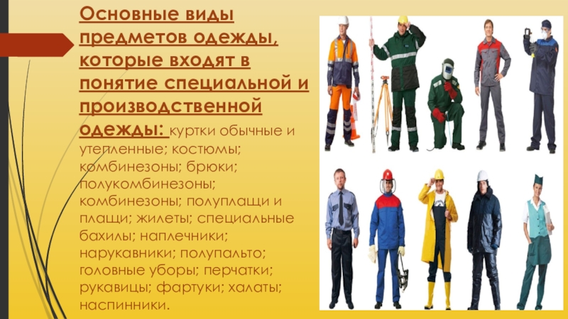 Слайд 8Основные виды предметов одежды, которые входят в понятие специальной и производственной