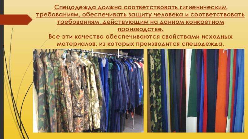 Слайд 4Спецодежда должна соответствовать гигиеническим требованиям, обеспечивать защиту человека и соответствовать требованиям,