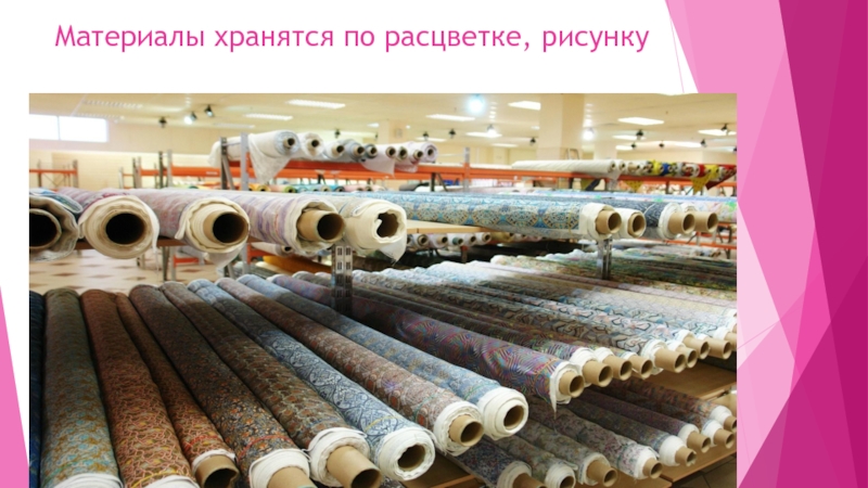 Слайд 8Материалы хранятся по расцветке, рисунку