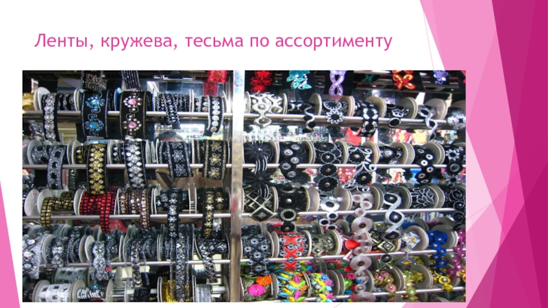 Слайд 10Ленты, кружева, тесьма по ассортименту