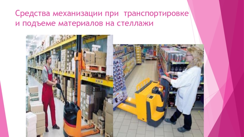 Слайд 4Средства механизации при транспортировке и подъеме материалов на стеллажи