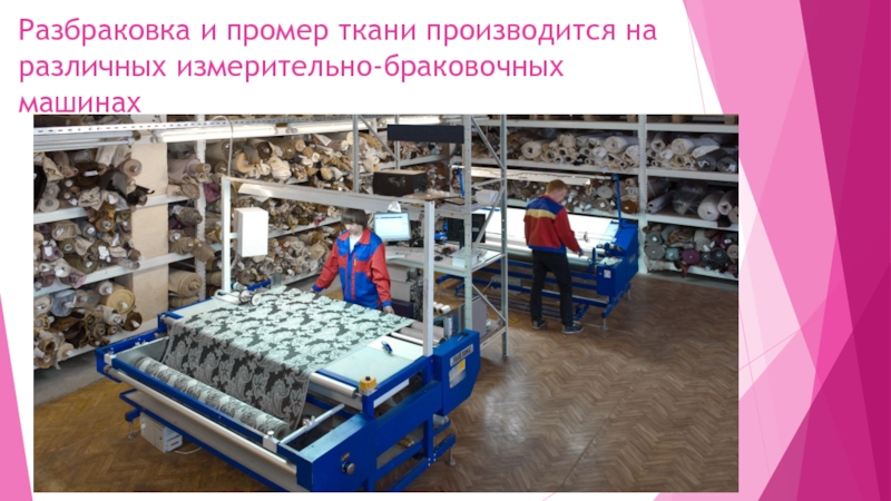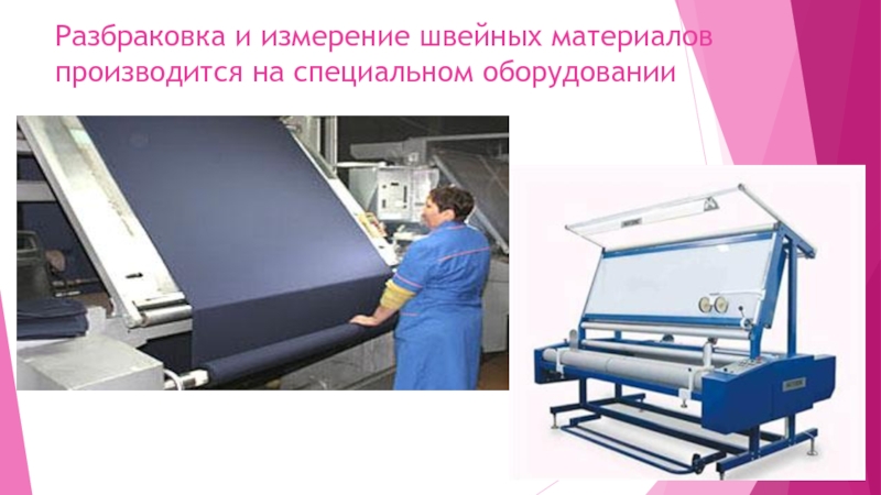 Слайд 14Разбраковка и измерение швейных материалов производится на специальном оборудовании