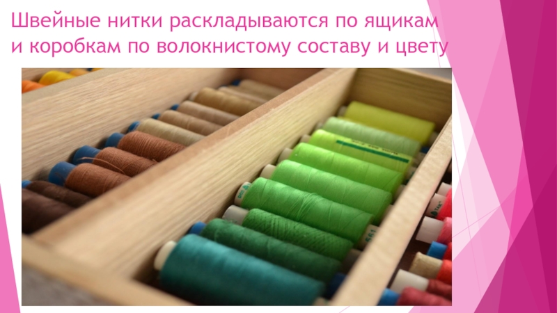 Слайд 13Швейные нитки раскладываются по ящикам и коробкам по волокнистому составу и