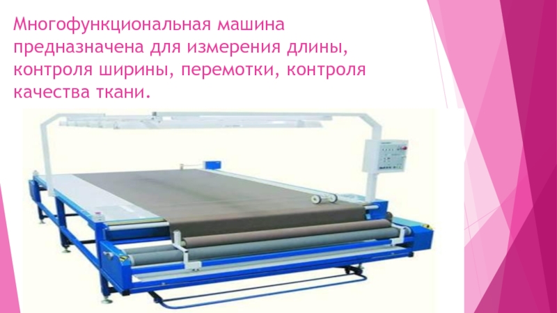 Слайд 18Многофункциональная машина предназначена для измерения длины, контроля ширины, перемотки, контроля качества