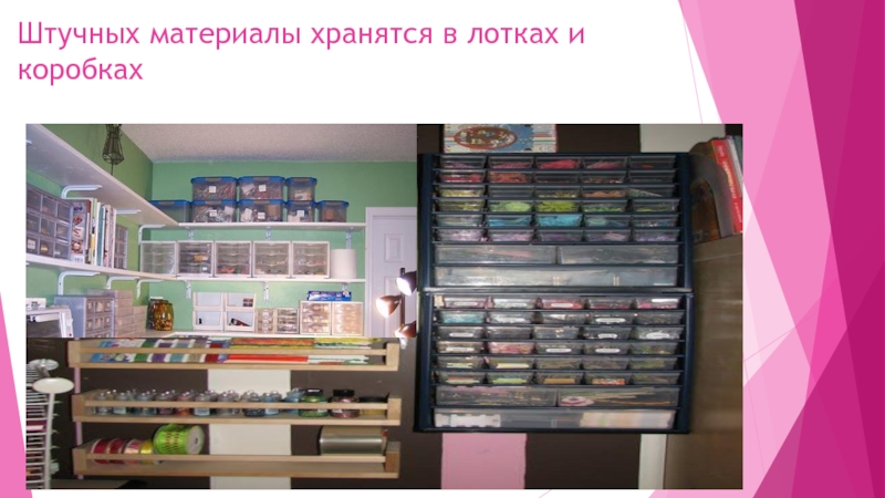Слайд 12Штучных материалы хранятся в лотках и коробках