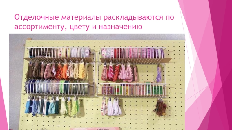 Слайд 9Отделочные материалы раскладываются по ассортименту, цвету и назначению
