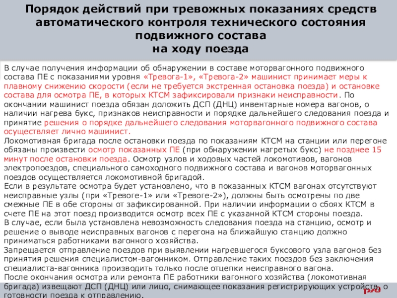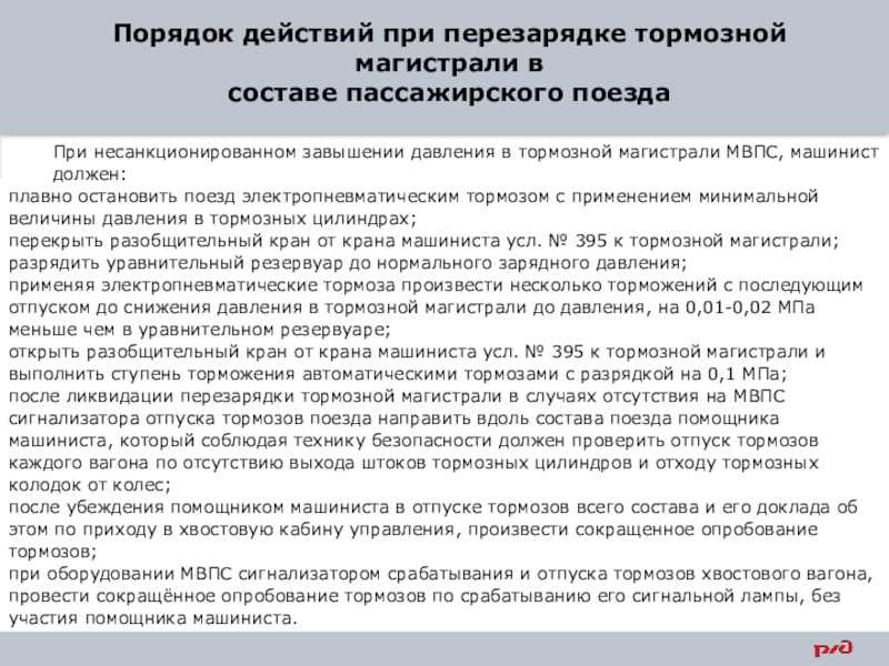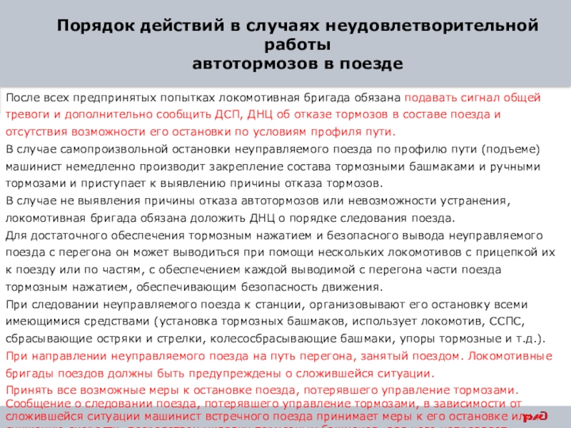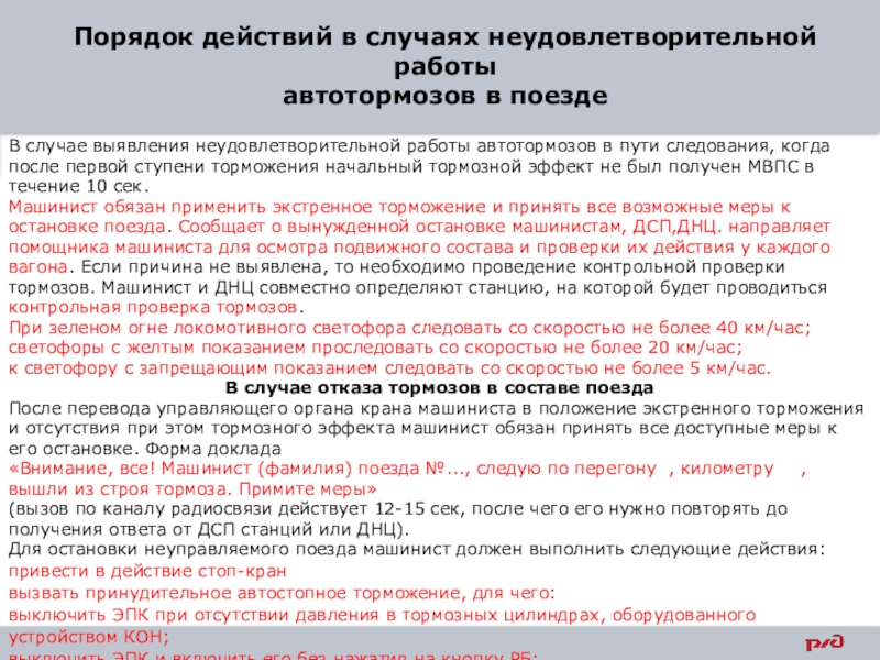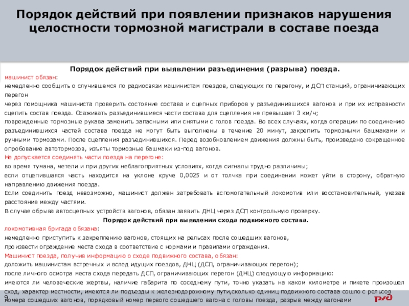 Слайд 9Порядок действий при появлении признаков нарушения целостности тормозной магистрали в составе