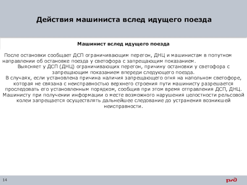 снизить скорость движения поезда служебным торможением и проследовать вдоль остановившегося поезда со скоростью не более 20 км/час, с особой бдительностью и готовностью остановиться…