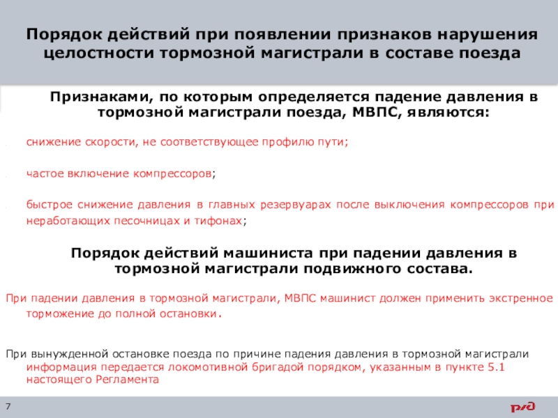 Слайд 7Порядок действий при появлении признаков нарушения целостности тормозной магистрали в составе