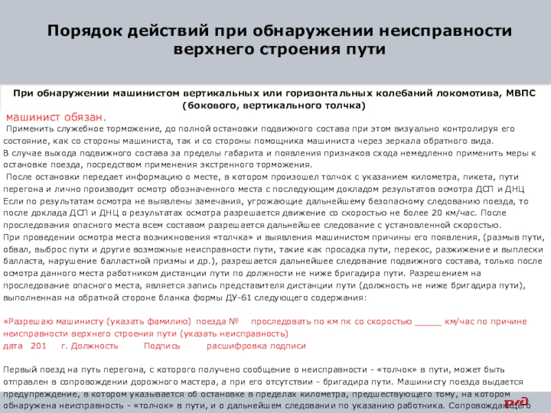 «Я, машинист поезда №_____фамилия, понял, поезд № __остановился на ___км __пикете, пути, перегона, произвести пометку в бланке ДУ-61 о месте препятствия и принять меры к обеспечению безопасности движения поезда.