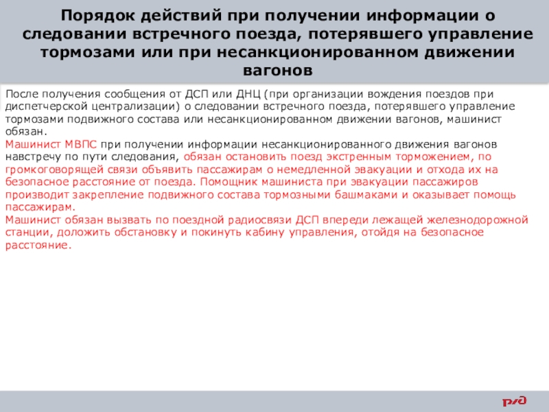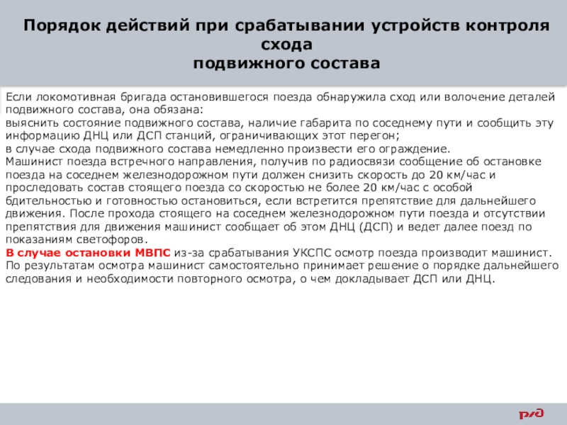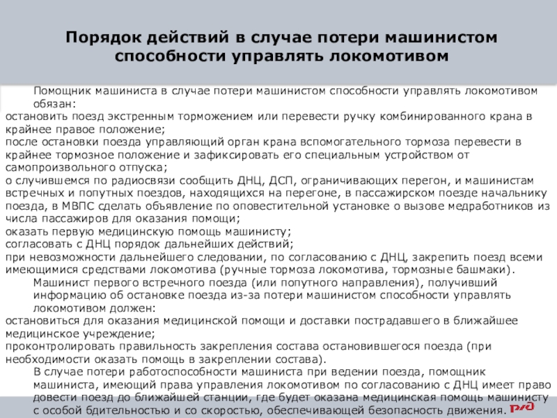 Слайд 36Порядок действий в случае потери машинистом способности управлять локомотивом