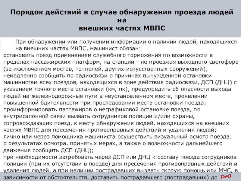Отправление поезда с перегона или станции осуществляется по согласованию с ДСП (ДНЦ) после удаления сотрудниками полиции людей с внешних частей МВПС или их добровольного ухода с внешних частей МВПС.