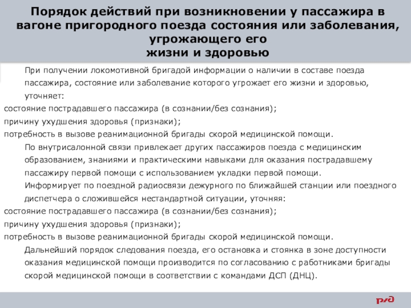 Слайд 42Порядок действий при возникновении у пассажира в вагоне пригородного поезда состояния