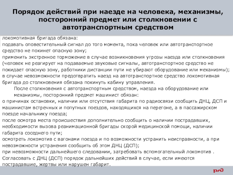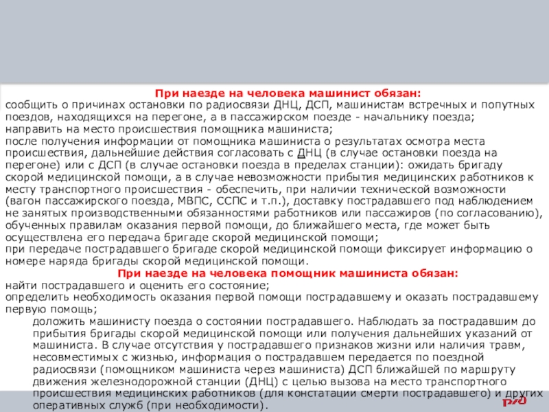 доложить машинисту поезда о состоянии пострадавшего. Наблюдать за пострадавшим до прибытия бригады скорой медицинской помощи или получения дальнейших указаний от машиниста. В случае отсутствия у пострадавшего признаков жизни или наличия травм, несовместимых с жизнью, информация о пострадавшем передается по поездной радиосвязи (помощником машиниста через машиниста) ДСП ближайшей по маршруту движения железнодорожной станции (ДНЦ) с целью вызова на место транспортного происшествия медицинских работников (для констатации смерти пострадавшего) и других оперативных служб (при необходимости).