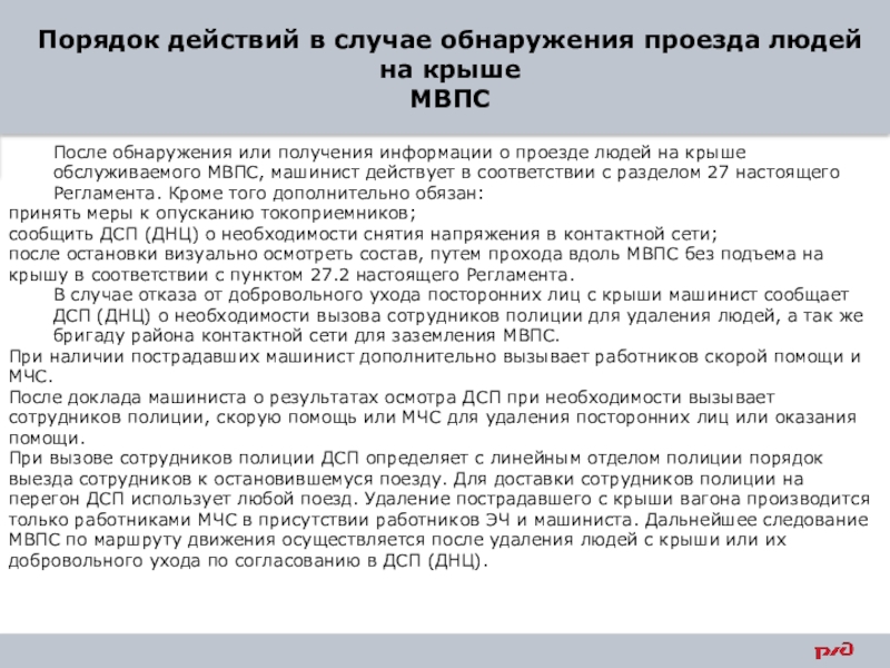 получения информации о проезде людей на крыше обслуживаемого МВПС, машинист действует в соответствии с разделом 27 настоящего Регламента. Кроме того дополнительно обязан: