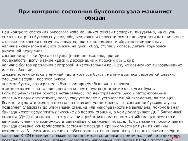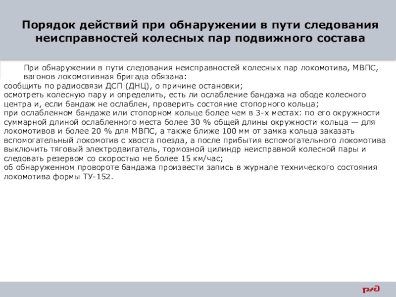 осмотреть локомотив с вагонами поезда и по возможности устранить неисправности, а при невозможности устранения сообщить об этом ДНЦ (ДСП);