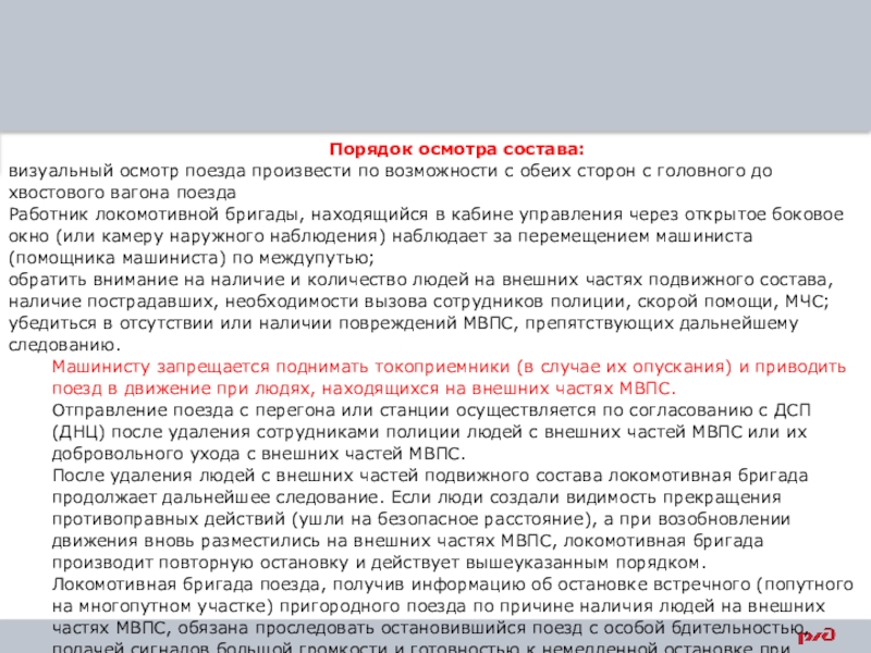 после остановки визуально осмотреть состав, путем прохода вдоль МВПС без подъема на крышу в соответствии с пунктом 27.2 настоящего Регламента.