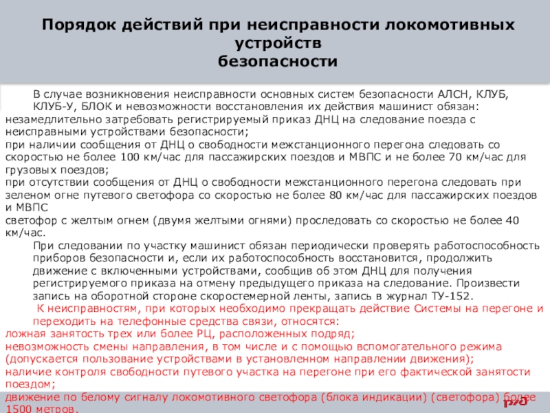 безопасности АЛСН, КЛУБ, КЛУБ-У, БЛОК и невозможности восстановления их действия машинист обязан: