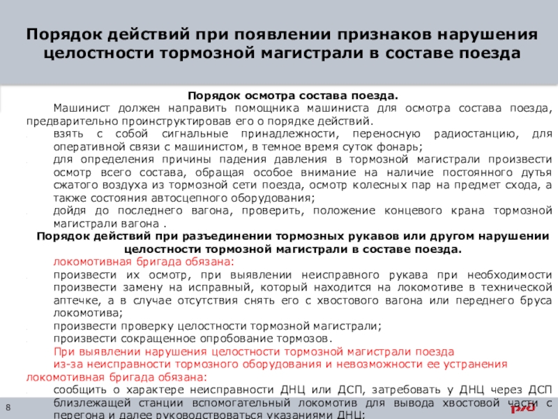 Слайд 8Порядок действий при появлении признаков нарушения целостности тормозной магистрали в составе
