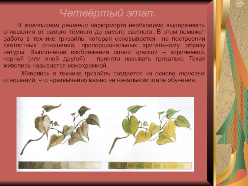 выдерживать отношения от самого тёмного до самого светлого. В этом поможет работа в технике гризайль, которая основывается на построении светлотных отношений, пропорциональных зрительному образу натуры. Выполнение изображения одной краской – коричневой, черной (или иной другой) – принято называть гризалью. Такая живопись называется монохромной.