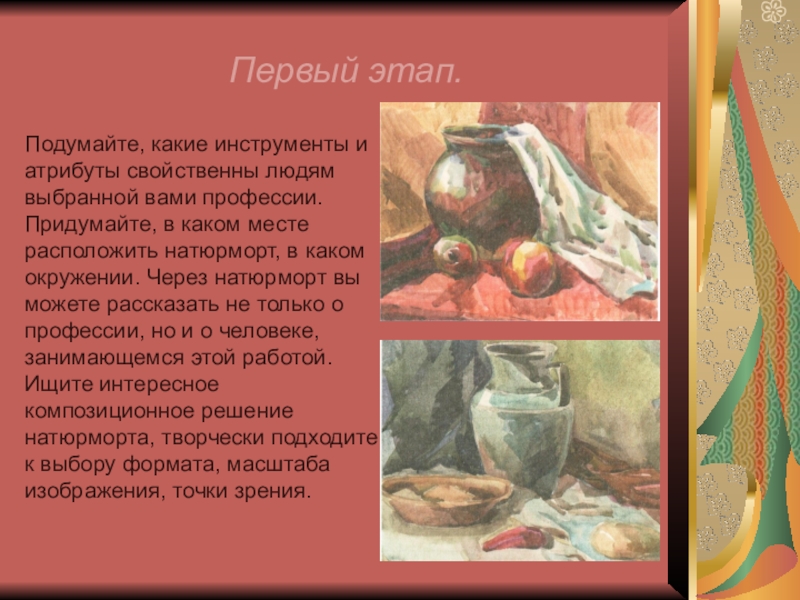 выбранной вами профессии. Придумайте, в каком месте расположить натюрморт, в каком окружении. Через натюрморт вы можете рассказать не только о профессии, но и о человеке, занимающемся этой работой. Ищите интересное композиционное решение натюрморта, творчески подходите к выбору формата, масштаба изображения, точки зрения.