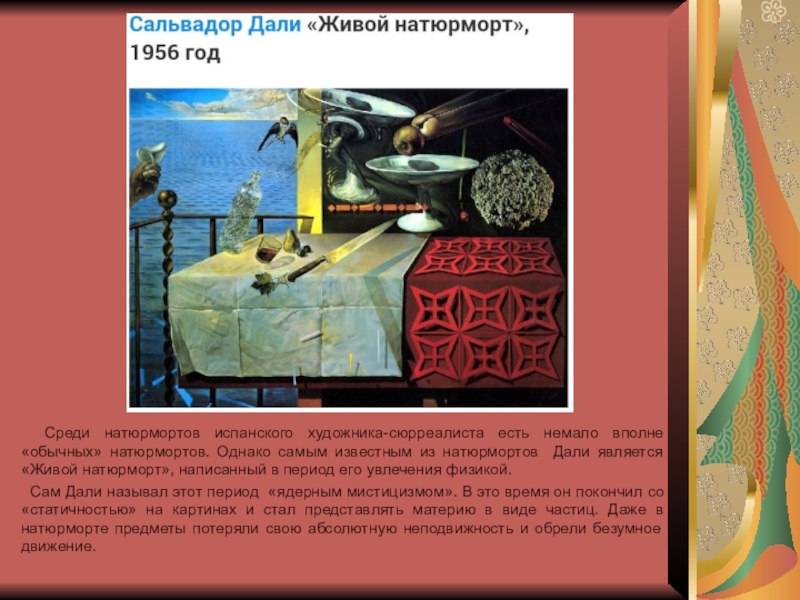 Слайд 28 Среди натюрмортов испанского художника-сюрреалиста есть немало вполне «обычных» натюрмортов. Однако