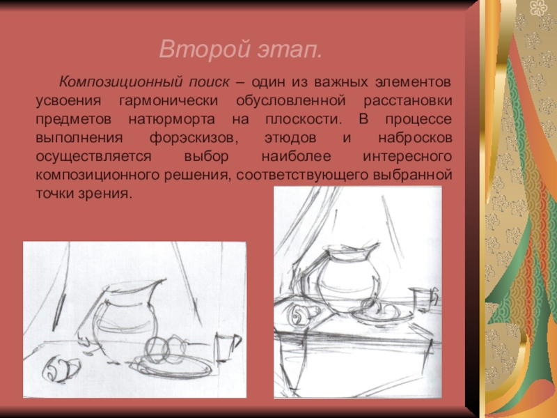 элементов усвоения гармонически обусловленной расстановки предметов натюрморта на плоскости. В процессе выполнения форэскизов, этюдов и набросков осуществляется выбор наиболее интересного композиционного решения, соответствующего выбранной точки зрения.