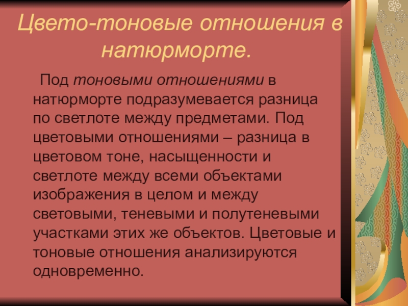 подразумевается разница по светлоте между предметами. Под цветовыми отношениями – разница в цветовом тоне, насыщенности и светлоте между всеми объектами изображения в целом и между световыми, теневыми и полутеневыми участками этих же объектов. Цветовые и тоновые отношения анализируются одновременно.