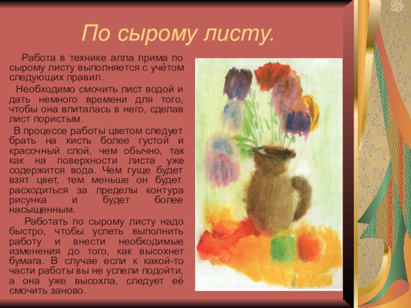 В процессе работы цветом следует брать на кисть более густой и красочный слой, чем обычно, так как на поверхности листа уже содержится вода. Чем гуще будет взят цвет, тем меньше он будет расходиться за пределы контура рисунка и будет более насыщенным.