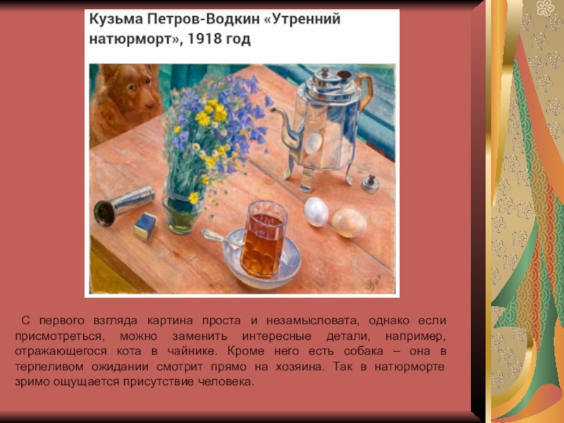 можно заменить интересные детали, например, отражающегося кота в чайнике. Кроме него есть собака – она в терпеливом ожидании смотрит прямо на хозяина. Так в натюрморте зримо ощущается присутствие человека.