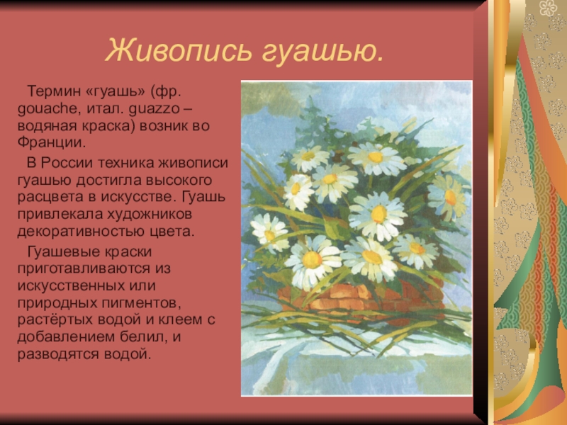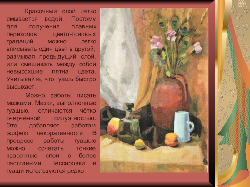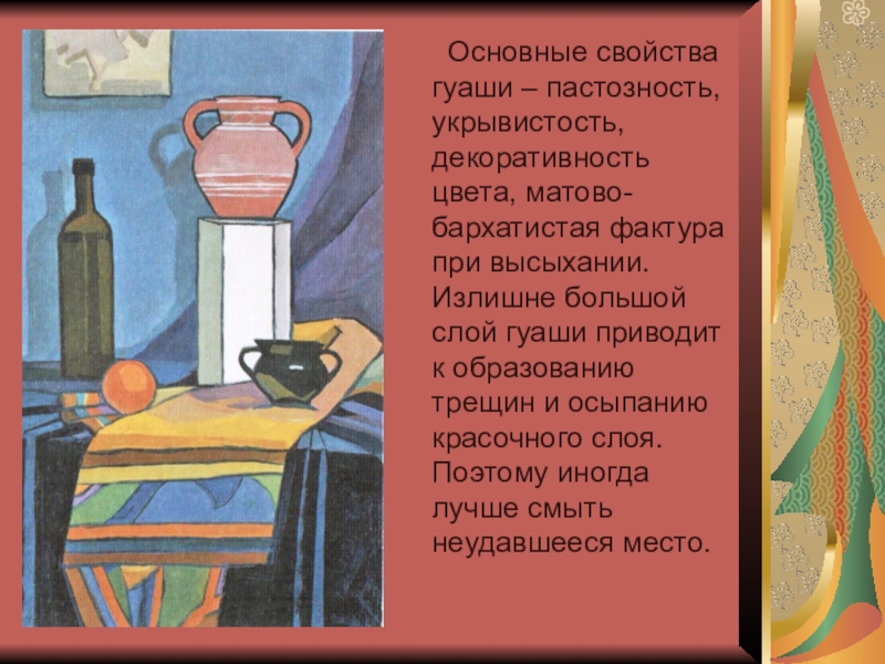 Слайд 23 Основные свойства гуаши – пастозность, укрывистость, декоративность цвета,