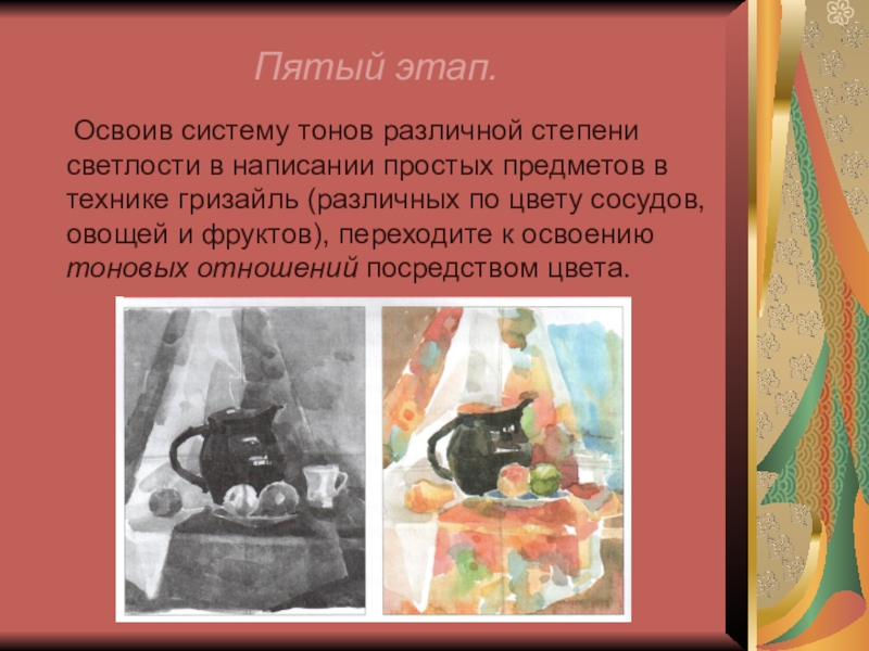 написании простых предметов в технике гризайль (различных по цвету сосудов, овощей и фруктов), переходите к освоению тоновых отношений посредством цвета.