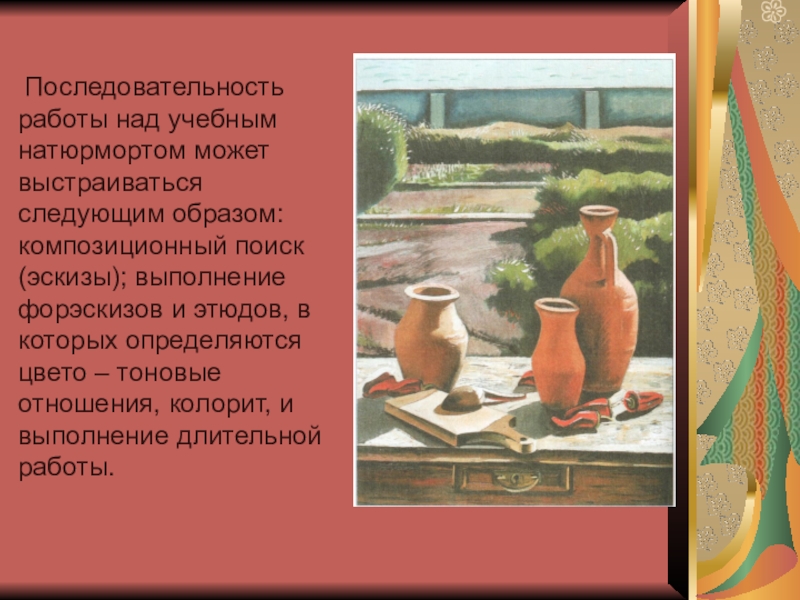 Слайд 4 Последовательность работы над учебным натюрмортом может выстраиваться следующим