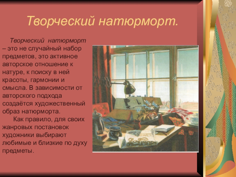 это активное авторское отношение к натуре, к поиску в ней красоты, гармонии и смысла. В зависимости от авторского подхода создаётся художественный образ натюрморта.