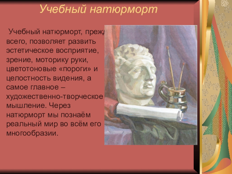 Учебный натюрморт, прежде всего, позволяет развить эстетическое восприятие, зрение,