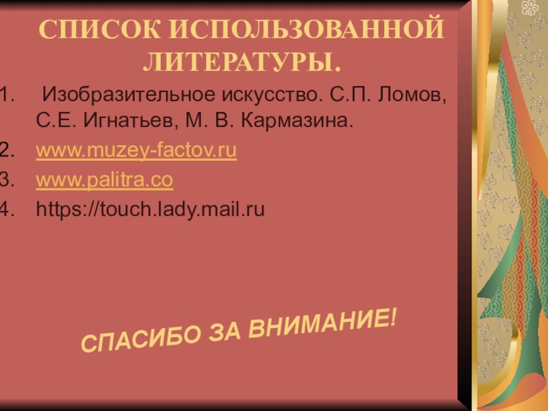 Слайд 29СПИСОК ИСПОЛЬЗОВАННОЙ ЛИТЕРАТУРЫ.