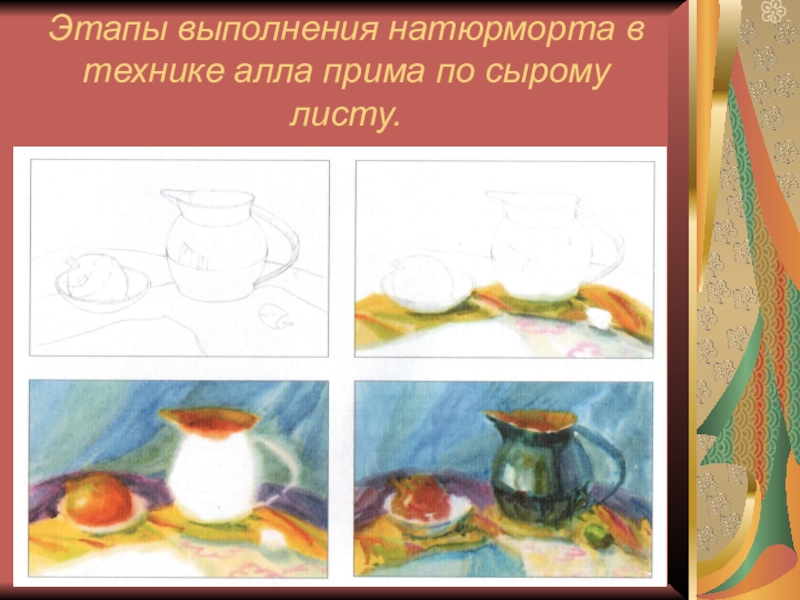Слайд 21Этапы выполнения натюрморта в технике алла прима по сырому листу.