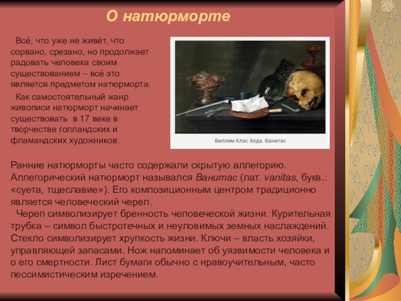 Ранние натюрморты часто содержали скрытую аллегорию. Аллегорический натюрморт назывался Ванитас (лат. vanitas, букв.: «суета, тщеславие»). Его композиционным центром традиционно является человеческий череп.