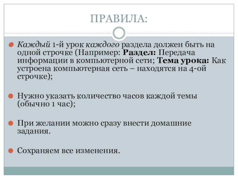 ПРАВИЛА:Каждый 1-й урок каждого раздела должен быть на одной строчке (Например: Раздел: Передача информации в компьютерной сети;