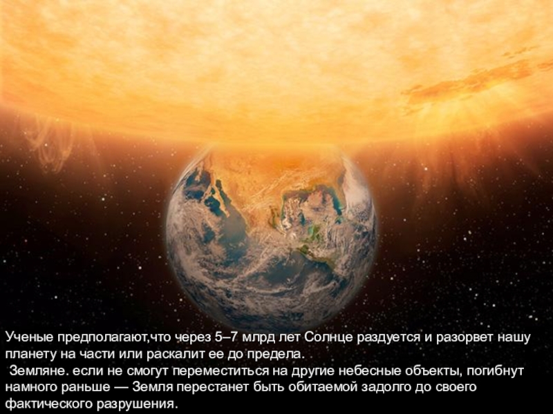 Ученые предполагают,что через 5–7 млрд лет Солнце раздуется и разорвет нашу планету на части или раскалит ее до предела.