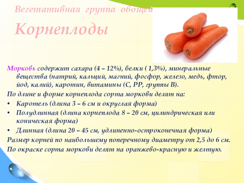 Морковь содержит сахара (4 – 12%), белки (