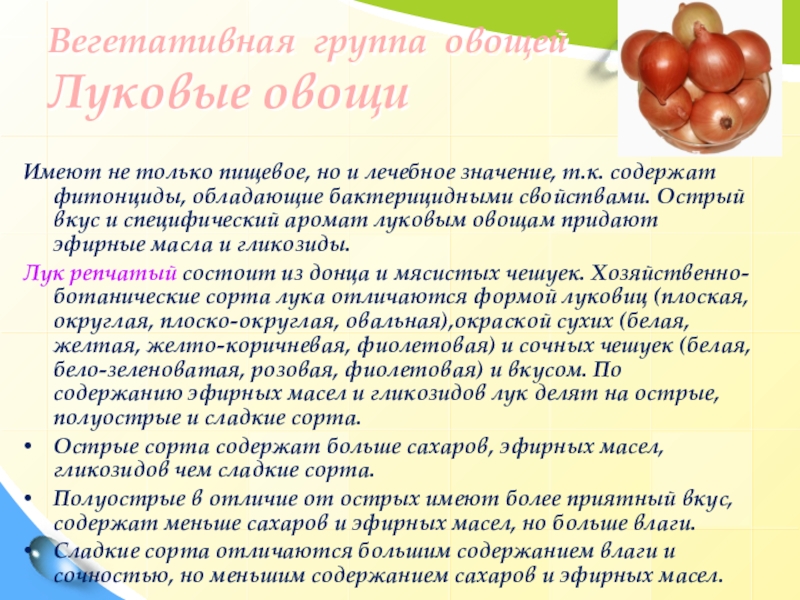 т.к. содержат фитонциды, обладающие бактерицидными свойствами. Острый вкус и специфический аромат луковым овощам придают эфирные масла и гликозиды.
