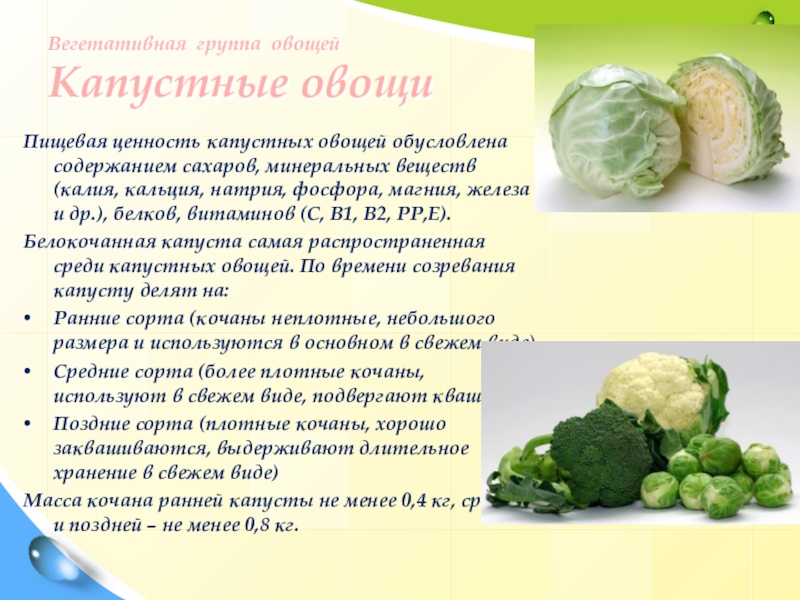 Пищевая ценность капустных овощей обусловлена содержанием сахаров, минеральных