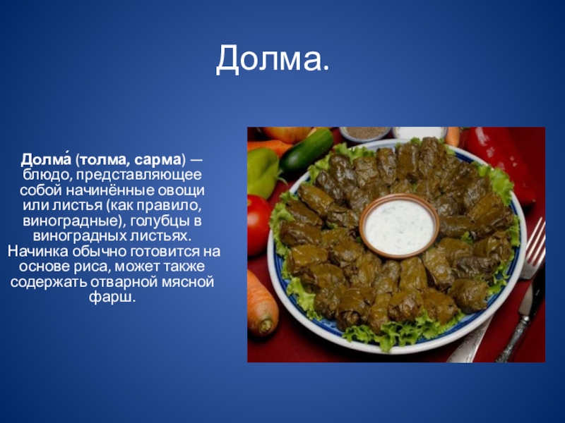 Долма́ (толма, сарма) — блюдо, представляющее собой начинённые овощи или листья (как