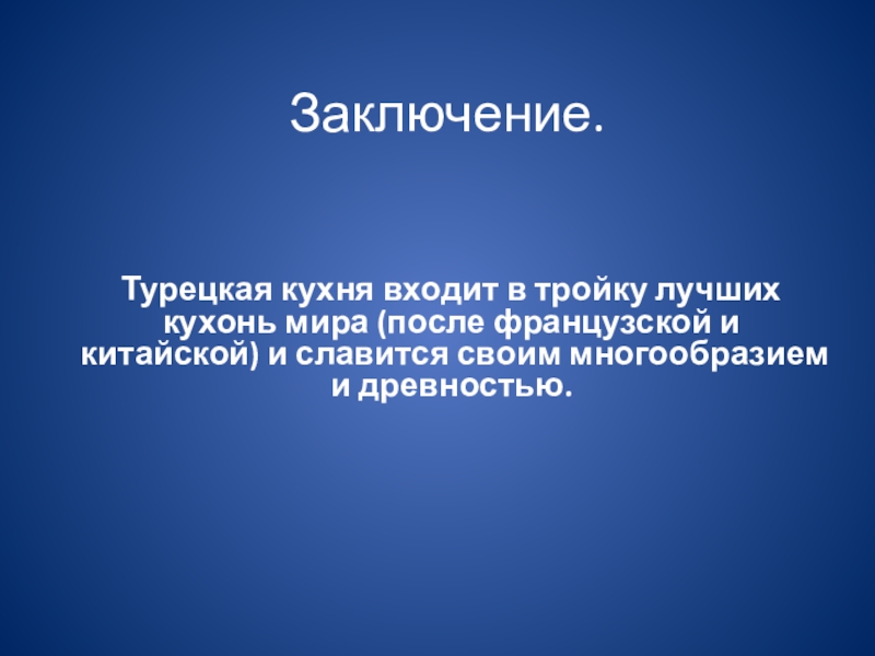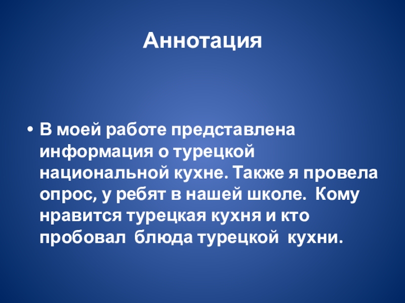 В моей работе представлена информация о турецкой национальной кухне. Также я