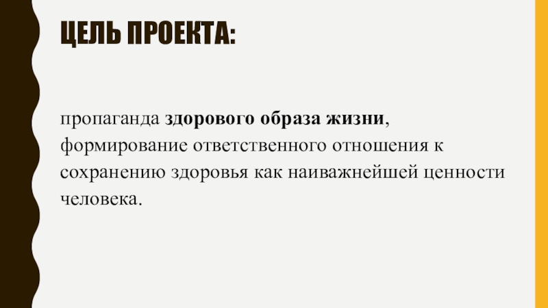 Цель проекта: пропаганда здорового образа жизни, формирование ответственного отношения к сохранению здоровья как наиважнейшей ценности человека.